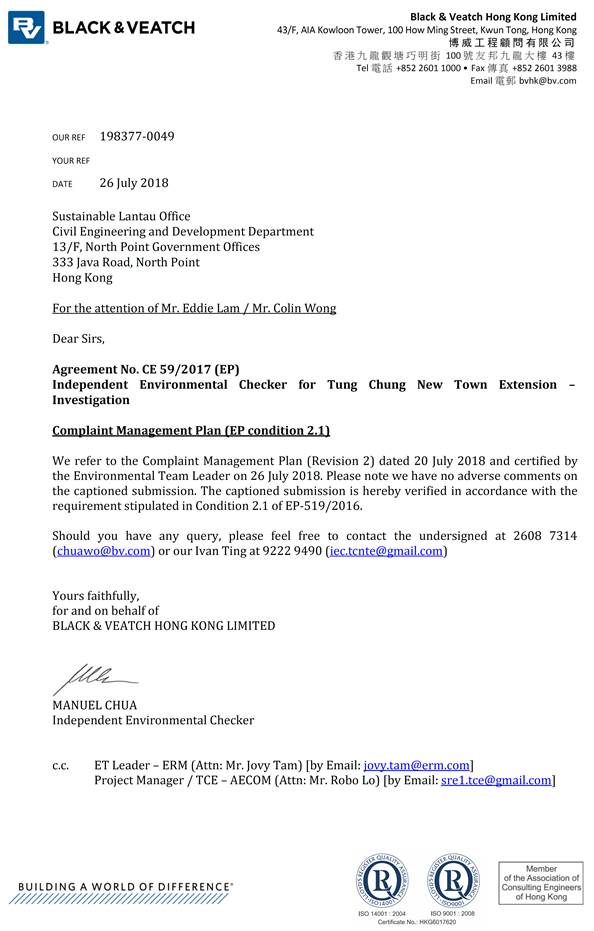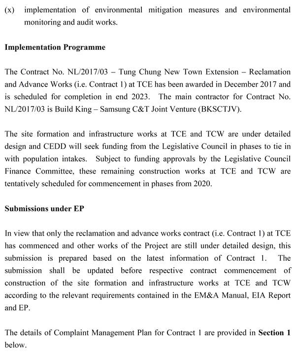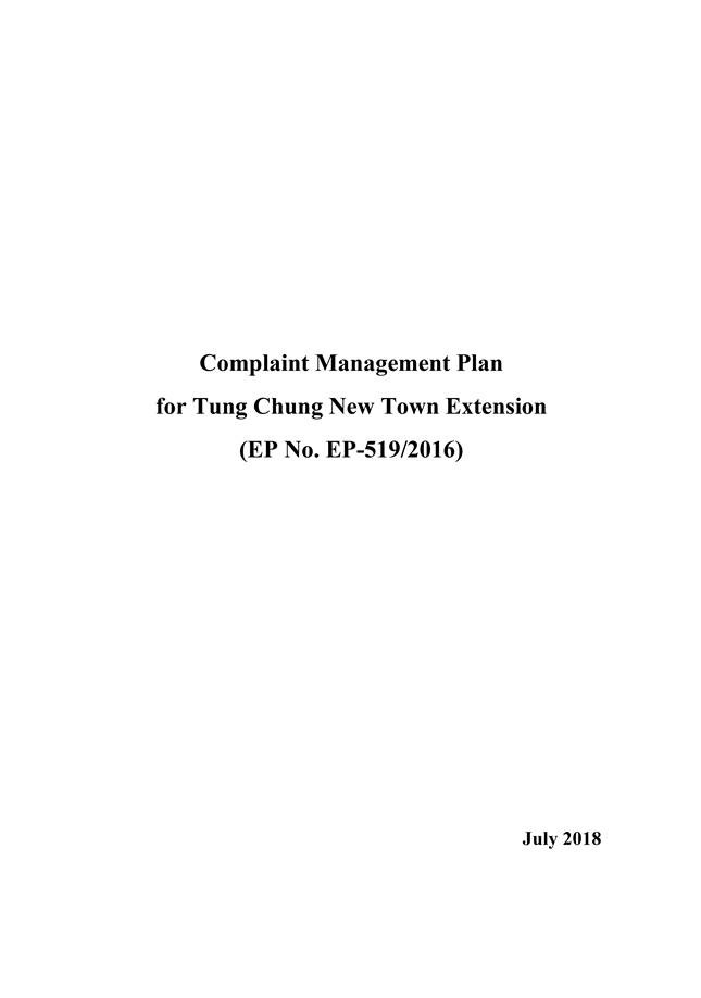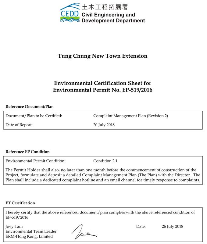 The Environmental Impact Assessment (EIA) Report (Register No.: AEIAR-196/2016) prepared for the ¡§Tung Chung New Town Extension¡¨ (the project) has been approved by the Director of Environmental Protection, and an Environmental Permit (Permit No.: EP-519/2016) has been issued for the project under the Environmental Impact Assessment Ordinance.  Pursuant to Condition 2.1 of the Environmental Permit (EP), BKSCTJV is required to formulate and deposit a detailed CMP which include a dedicated complaint hotline and an email channel for timely response to complaints. The requirement related to complaints handling involves providing the means to ensure timely investigation and response to environmental complaints.