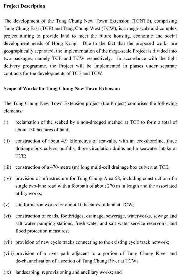 a)      Reclamation of the seabed by a non-dredged method at Tung Chung East (TCE) to form a total of about 130 hectares of land;