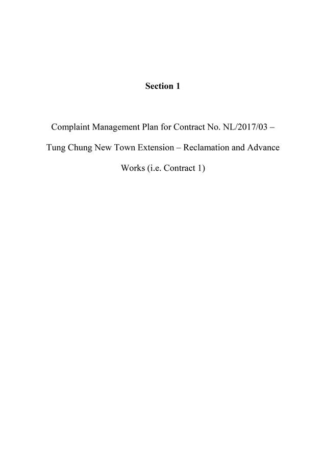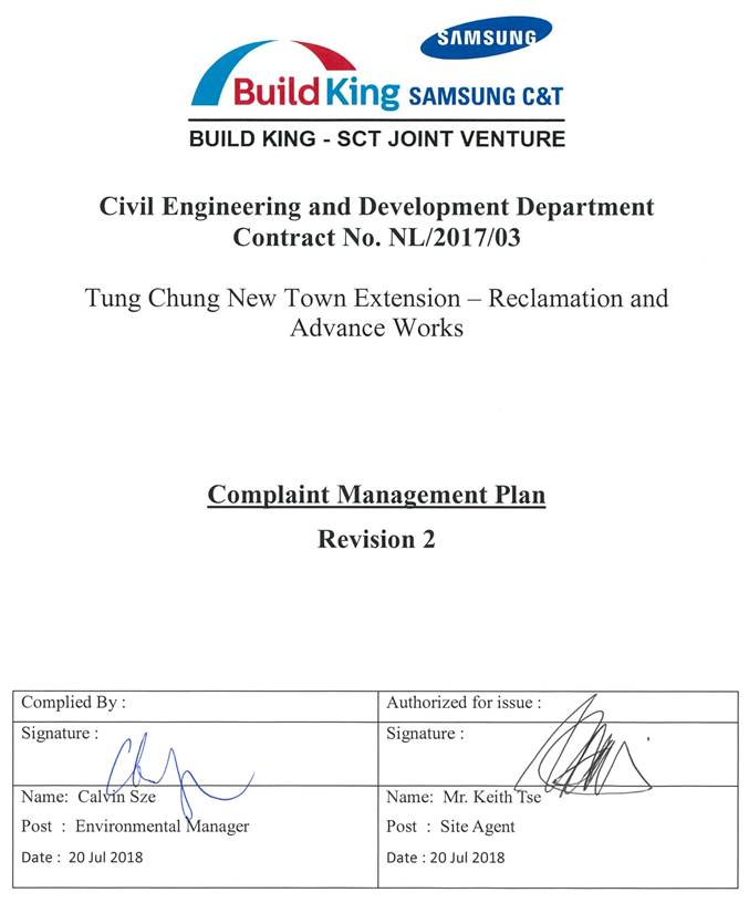 This plan will outline the Contractor Complaint Management Plan (CMP) proposed by the Contractor for the Civil Engineering and Development Department (CEDD) Contract (Contract No. NL/2017/03) - Tung Chung New Town Extension and Advance Works. The main contractor Build King ¡V Samsung C&T Joint Venture (hereinafter mentioned as BKSCTJV) will ensure that BKSCTJV will fully comply with requirements stipulated in this CMP.