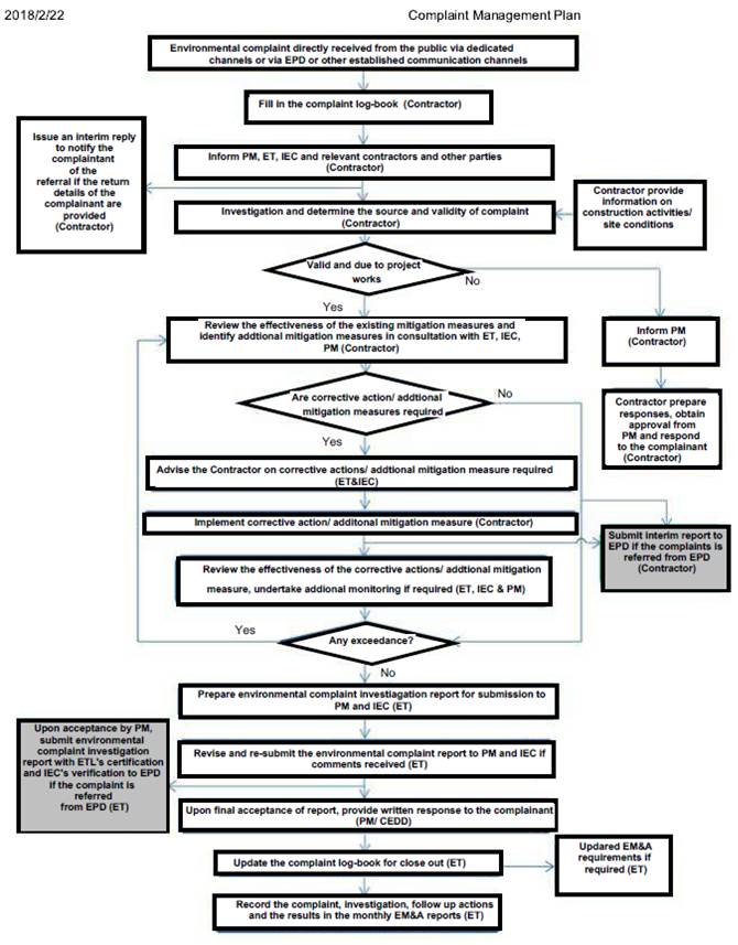 The Contractor is responsible for setting up and managing the dedicated complaint hotline and email channel. The Contractors have the primary responsibility for implementing the required mitigation measures and ensuring their works comply with all environmental legislation and the EP requirements as well as any additional conditions specified in their works contracts. The Contractors are responsible for providing all necessary input / information to the ET as part of the complaint investigation process. The Contractors are also required to implement all mitigation measures, corrective actions or any additional measures required to address environmental complaints.