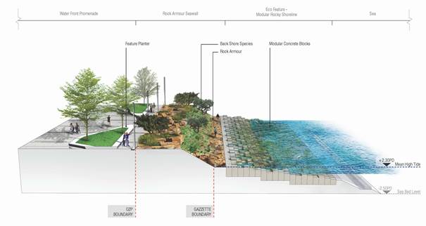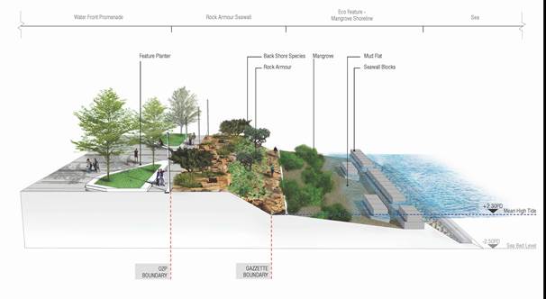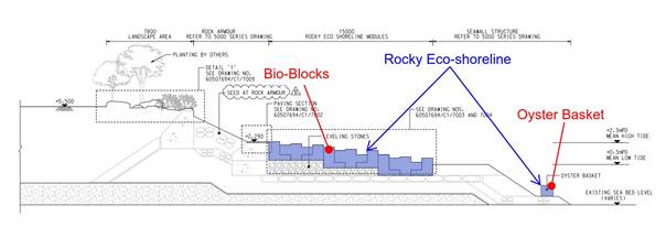 2.1.2 Eco-shoreline is to provide ecological functions to mitigate the loss of general marine habitat, while the function of coastal and shoreline protection should be provided by seawall structure. Elements of eco-shoreline such as mangroves, mudflat, oyster basket and bio-blocks will be installed/planted on top of seawall structure. The seawall structure was designed in accordance with Port Works Design Manual.