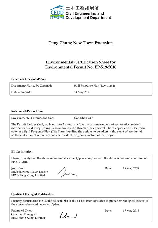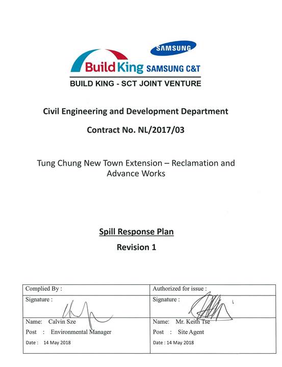 The following Spill Response Plan is required under Section 2.17 of Environmental Permit No. EP-519/2016, “The Permit Holder shall, no later than 3 months before the commencement of reclamation related marine works at Tung Chung East, submit to the Director for approval 3 hard copies and 1 electronic copy of a Spill Response Plan (The Plan) detailing the actions to be taken in the event of accidental spillage of oil or other hazardous chemicals during construction of the Project. Then Plan shall include vessels operating for the Project, with specific provisions for protecting water quality and marine ecology.
