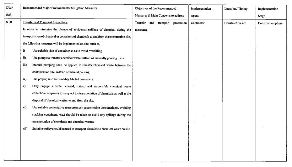 In order to minimize the chance of accidental spillage of chemical during the transportation of chemical or containers of chemicals to and from the construction site, the following measures will be implemented on site, such as,