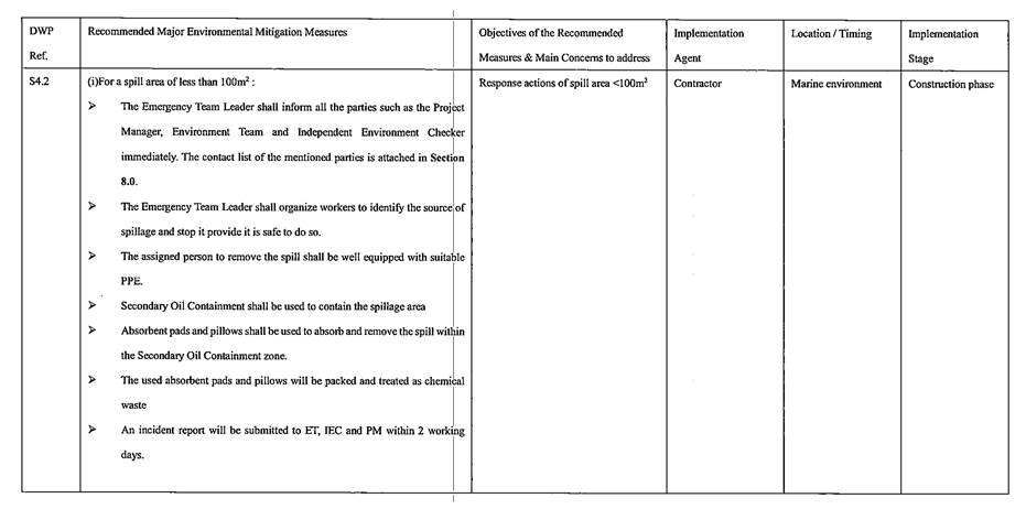 For the spillage is greater than 100m2, the Environmental Officer, the Project Manager, ET and IEC shall inspect the area to check that the spill is probably contained and suitable cleaning method is adopted. A photographic record shall be kept. The top management including the Construction Manager, Site Agent, Project Manager shall be informed. If there is full containment and no significant quantity entered into the marine environment, then the event shall be documented.