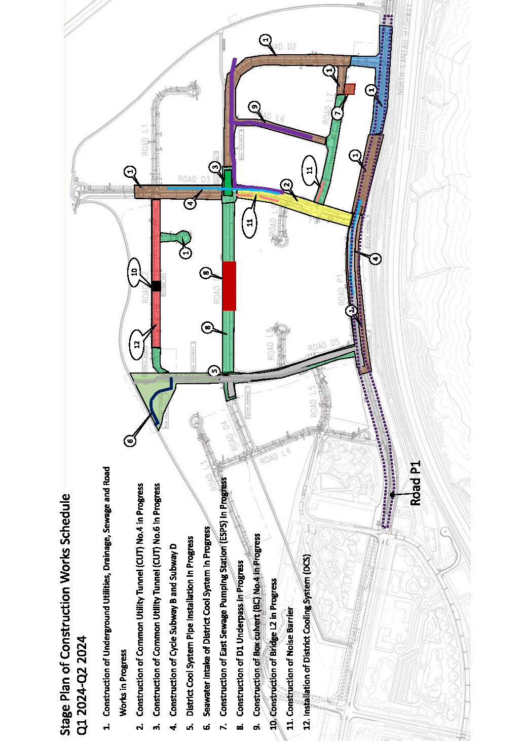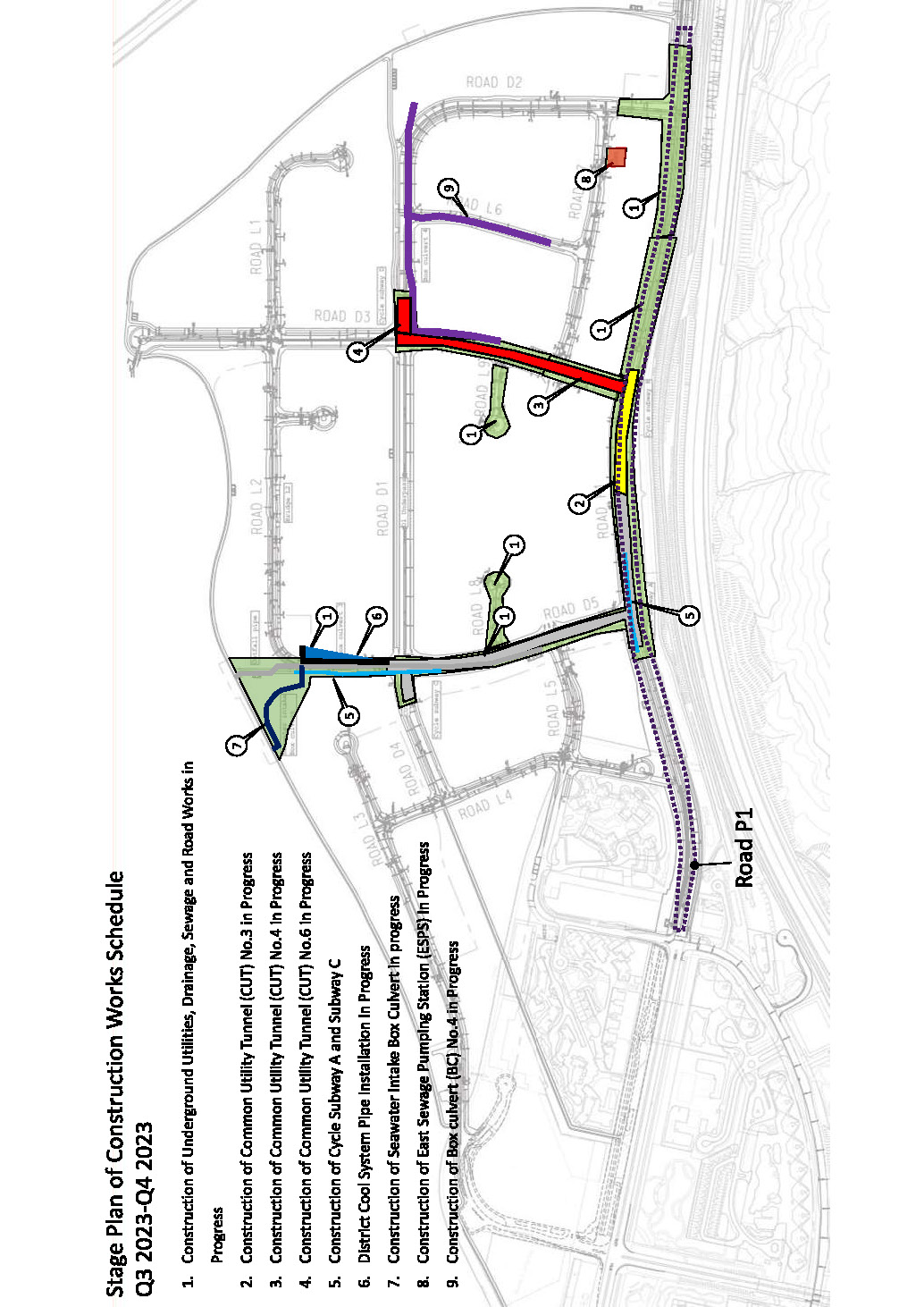 a)         Construction of engineering infrastructure including drainage works, sewerage works (including two sewage pumping stations), waterworks, roadworks (including carriageways, footpaths, cycle tracks and junction improvements), common utility tunnels and landscaping works; and