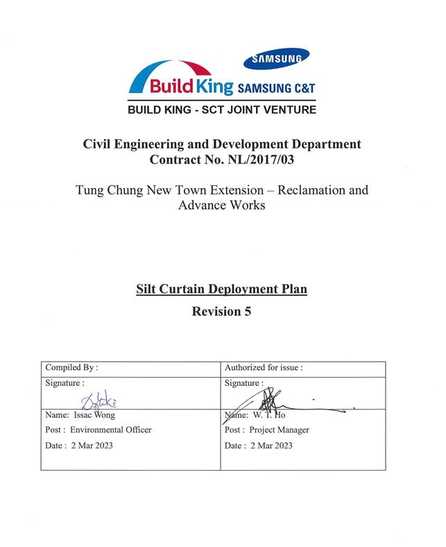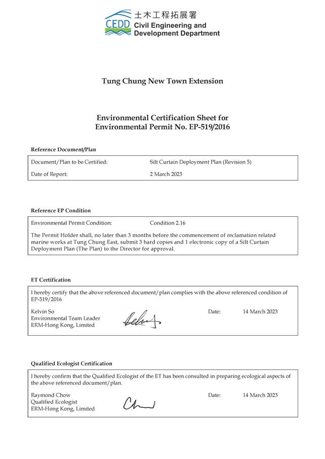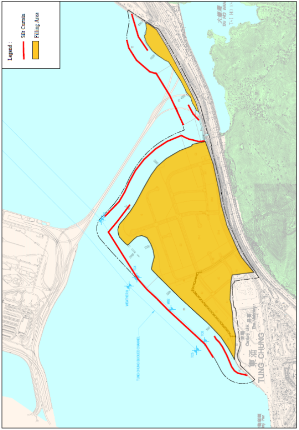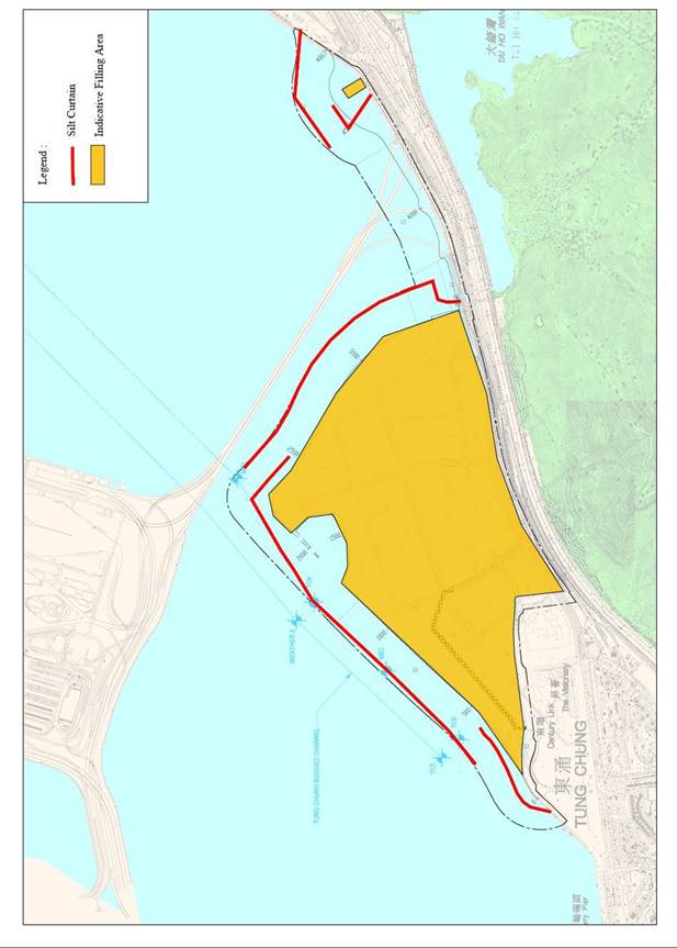 Under the Environmental Impact Assessment Ordinance, the Environmental Impact Assessment (EIA) Report (Register No. AEIAR-196/2016) prepared for the “Tung Chung New Town Extension” has been approved by the Environmental Protection Department (EPD), and an Environmental Permit (Permit no. EP-519/2016) has been issued for the project. Pursuant to Condition 2.16 of the Environmental Permit, Silt Curtain Deployment Plan should be submitted prior to the commencement of reclamation related to marine works at Tung Chung East. The plan includes the construction programme and detail on the design, operation, maintenance, regular patrol and monitoring of the silt curtain to be deployed during the construction.