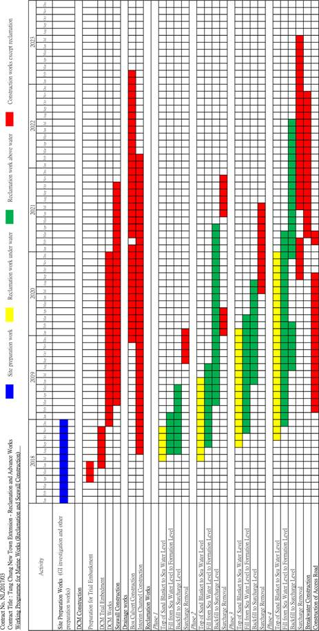 A brief programme showing the major reclamation works and their related works is enclosed in Appendix A. In general, perimeter silt curtain has to be deployed to enclose the works area as far as practicable. The minimum length of overlapping silt curtain and the width of gap between 1st and 2nd layer of silt curtain is 150m and 100m respectively. Where the marine works are not enclosed by perimeter silt curtain, localized silt curtain around the marine works shall be deployed to enclose the works area before start of the marine works. Additional localized silt curtain (frame type silt curtain) will also be deployed when placing sand with fine content of >5% to 10% onto the seabed (see Appendix C1 and Appendix C2). Some indicative phases of silt curtain deployment are presented as follows: