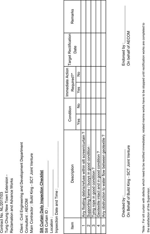 inspection checklists will be kept on site for record purpose. Refer Appendix D for the sample of Silt Curtain Daily Inspection Checklist. Diver inspection will be arranged after adverse weather