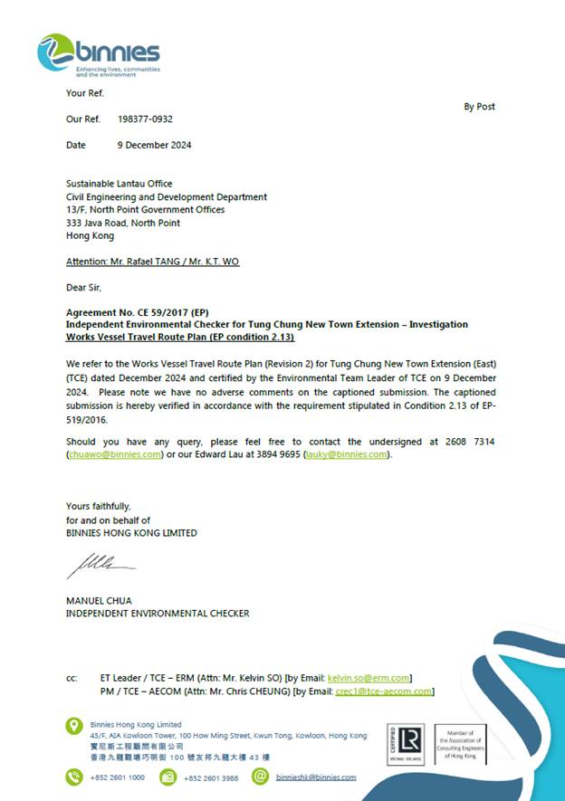 Layout Plan showing Tung Chung East Reclamation Site, Southern Viaduct of Tuen Mun-Chek Lap Kok (TMCLK) Link, Tung Chung Buoyed Channel and Brothers Marine Park is shown in Appendix B.