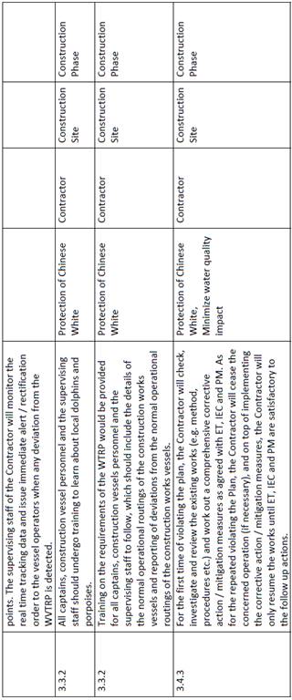 The potential impact of cumulative marine traffic disturbance or collision risk on dolphin due to large sized and slowly moving working vessels with relatively low traffic flow during towing are anticipated to be low. Nevertheless, speed limits and regular travel routes will be implemented to control and minimize marine traffic disturbance on dolphins. The supervising staff of the Contractor will record and control the trips to ensure not exceeding the daily and hourly trip basis. Moreover, good planning of construction vessel activities, minimize stationary/idle work vessels, reduction of waste materials will be implemented to minimize trips of the construction works vessels to and from the works site. Work vessels shall be scheduled tentatively at maximum 4 round trips for transportation of construction & demolition material at barging point on a daily basis. This is well within the maximum number of daily and hourly trips of the EP condition. The supervising staff of the Contractor will record and control the trips are well within the limit, in accordance to the EP Condition 2.13 of the environmental permit EP-519/2016, which specifies not exceeding 56 and 10 round trips on a daily and hourly basis respectively.