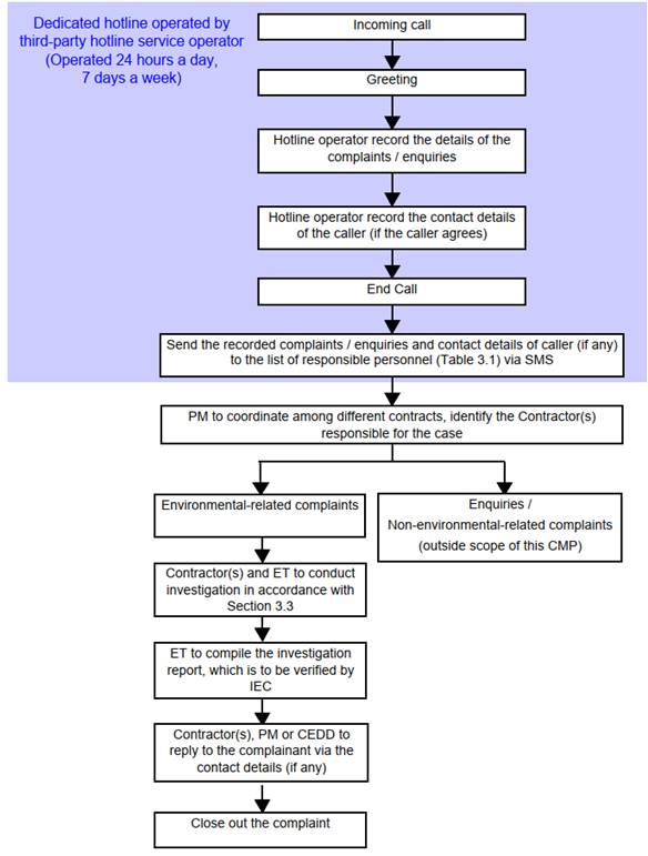 The public can raise environmental complaints that are related to the Project via telephone through the dedicated hotline or via email through the dedicated email mentioned in Section 2. Every complaint/enquiry case received by the hotline will be recorded and forwarded by the third-party hotline service operator to the list of responsible personnel of each TCE contract through SMS, tabulated in Table 3.1. For complaint/enquiry case received via email, the email will be automatically forwarded to the list of responsible personnel of each TCE contract tabulated in Table 3.1. If the complaint is environmental-related, based on the information provided by the caller (e.g. location and category of the complaint/enquiry), the PM will coordinate among different contracts, identify the responsible contractor(s) for the complaint and follow up with the responsible contractor(s) to ensure the CMP is being followed to address the complaint. The case will also be passed on from the responsible personnel to the Environmental Officer of the relevant contract for further investigation. The operation flow chart for the dedicated hotline is shown in Appendix B.