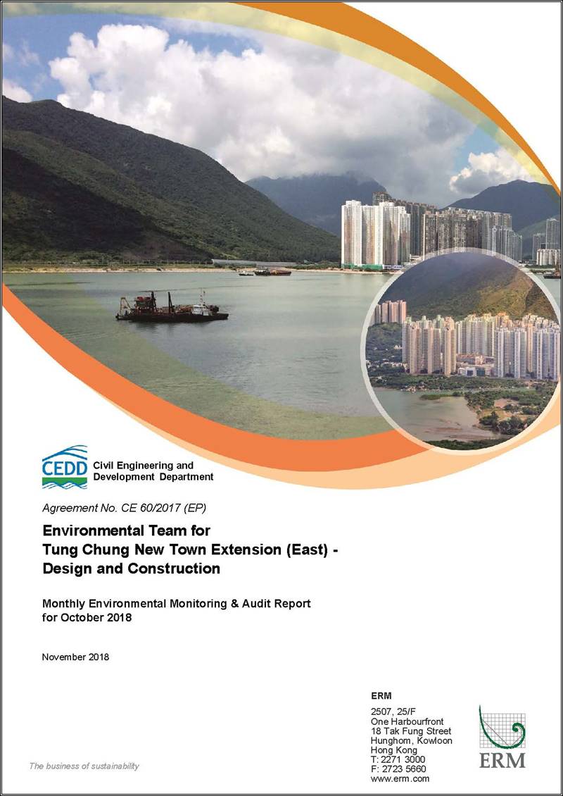 Potential environmental impacts arising from the above upcoming construction activities in the next reporting period of November 2018 are mainly associated with noise from barge and plant operation during normal working hours and restricted hours, elevation in SS due to sediment loss from sand blanket laying and marine filling works, disturbance to Chinese White Dolphin (CWD) during marine works, waste management for C&D materials and dust emission. The ET will keep track on the construction works to confirm compliance of environmental requirements and the proper implementation of all necessary mitigation measures. The ET will also recommend to the Contractor about the environmental toolbox topics on the abovementioned key issues for the coming month.