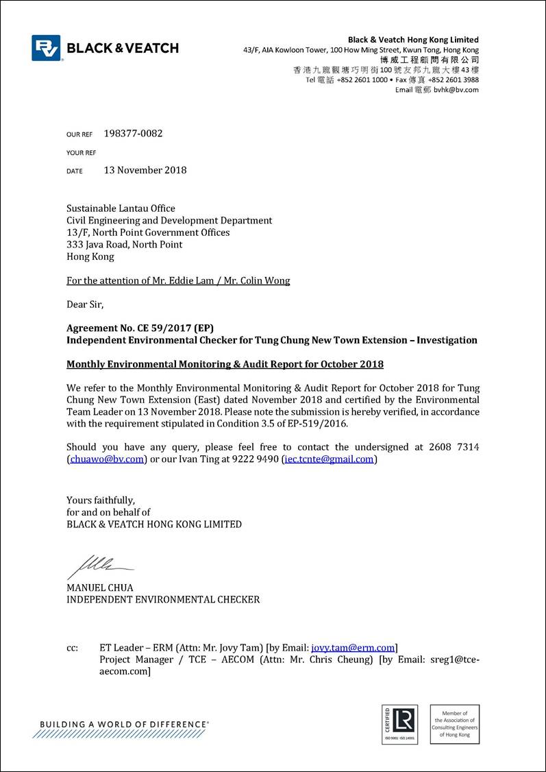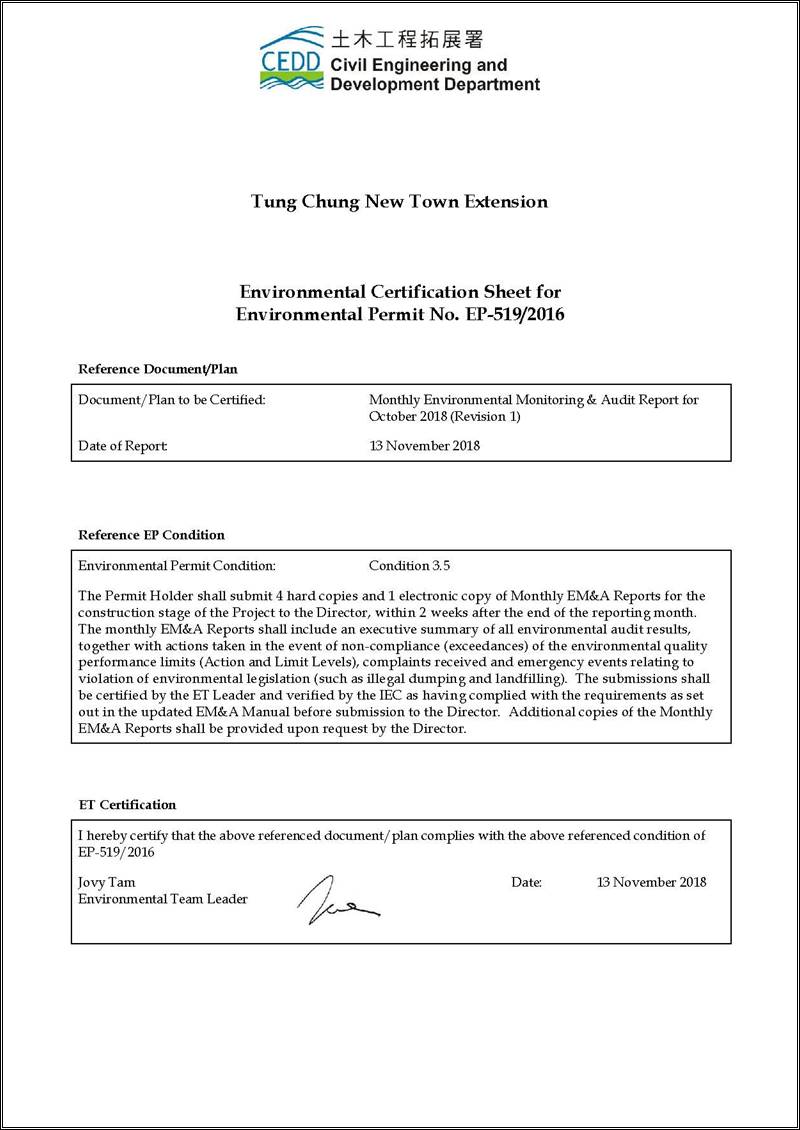 This EM&A Report presents the findings of the EM&A activities undertaken during the period from 1 to 31 October 2018 in accordance with the Updated EM&A Manual and the requirements of the Environmental Permit (EP-519/2016).