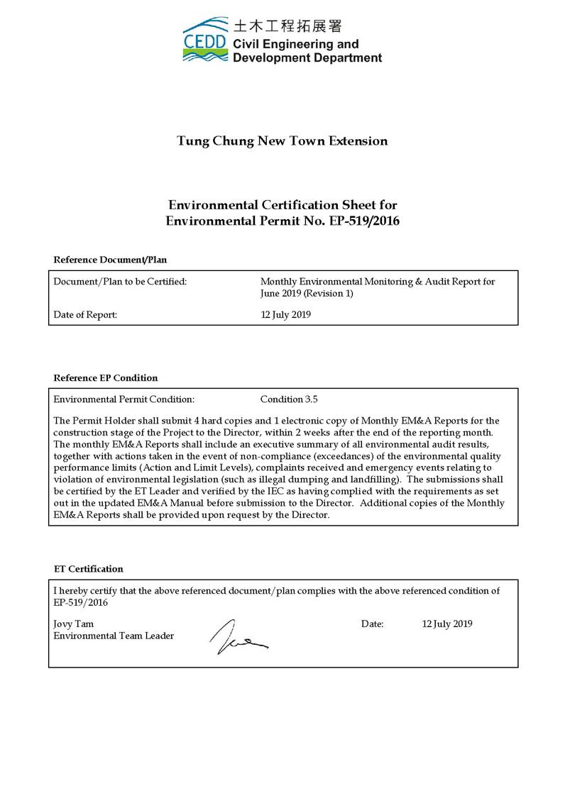 This EM&A Report presents the findings of the EM&A activities undertaken during the period from 1 to 30 June 2019 in accordance with the Updated EM&A Manual and the requirements of the Environmental Permit (EP-519/2016).