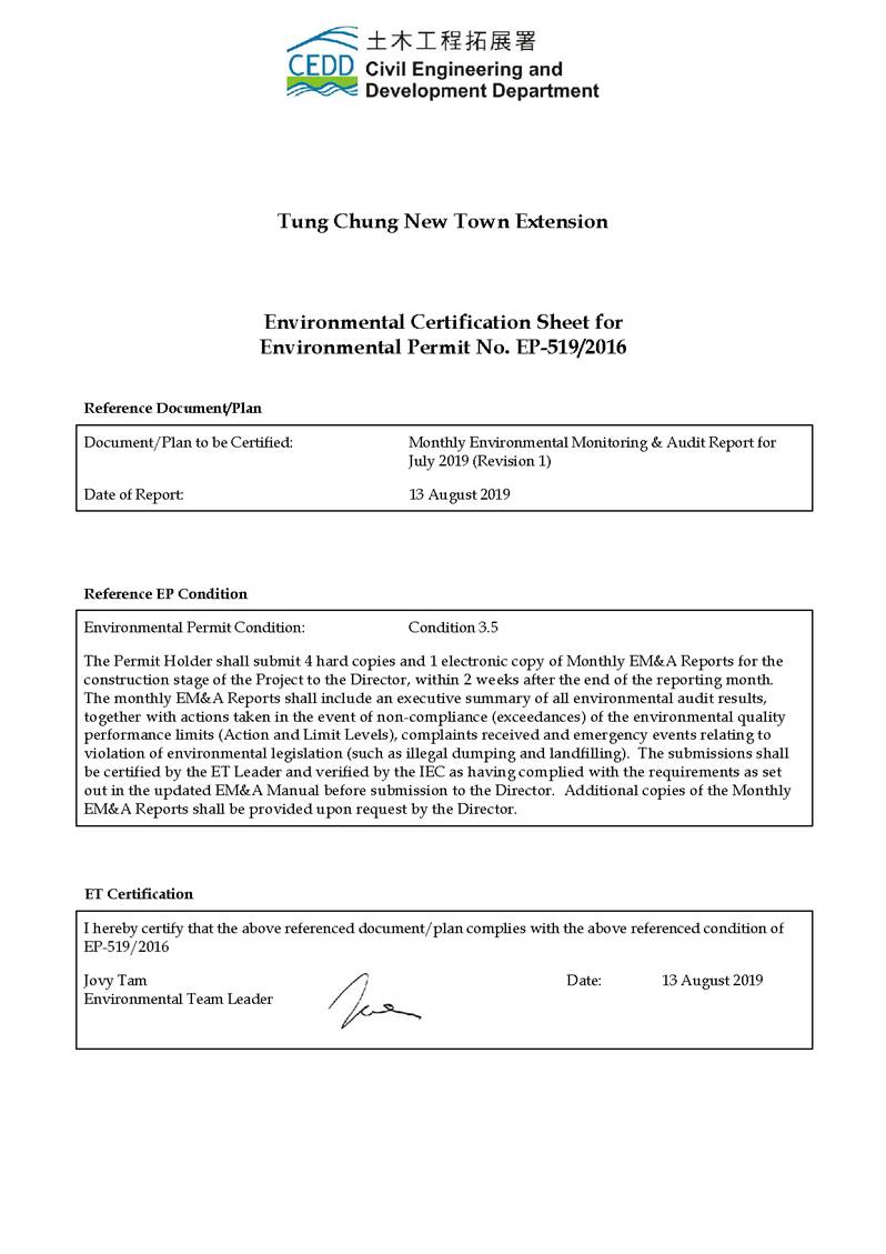 This EM&A Report presents the findings of the EM&A activities undertaken during the period from 1 to 31 July 2019 in accordance with the Updated EM&A Manual and the requirements of the Environmental Permit (EP-519/2016).