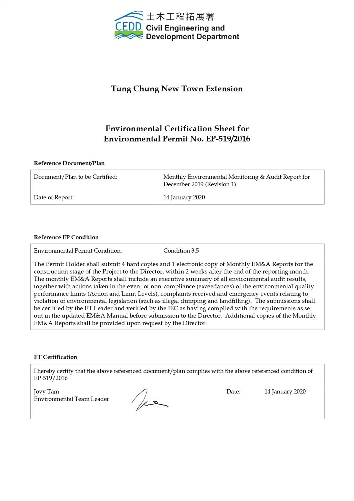 This EM&A Report presents the findings of the EM&A activities undertaken during the period from 1 to 31 December 2019 in accordance with the Updated EM&A Manual and the requirements of the Environmental Permit (EP-519/2016).