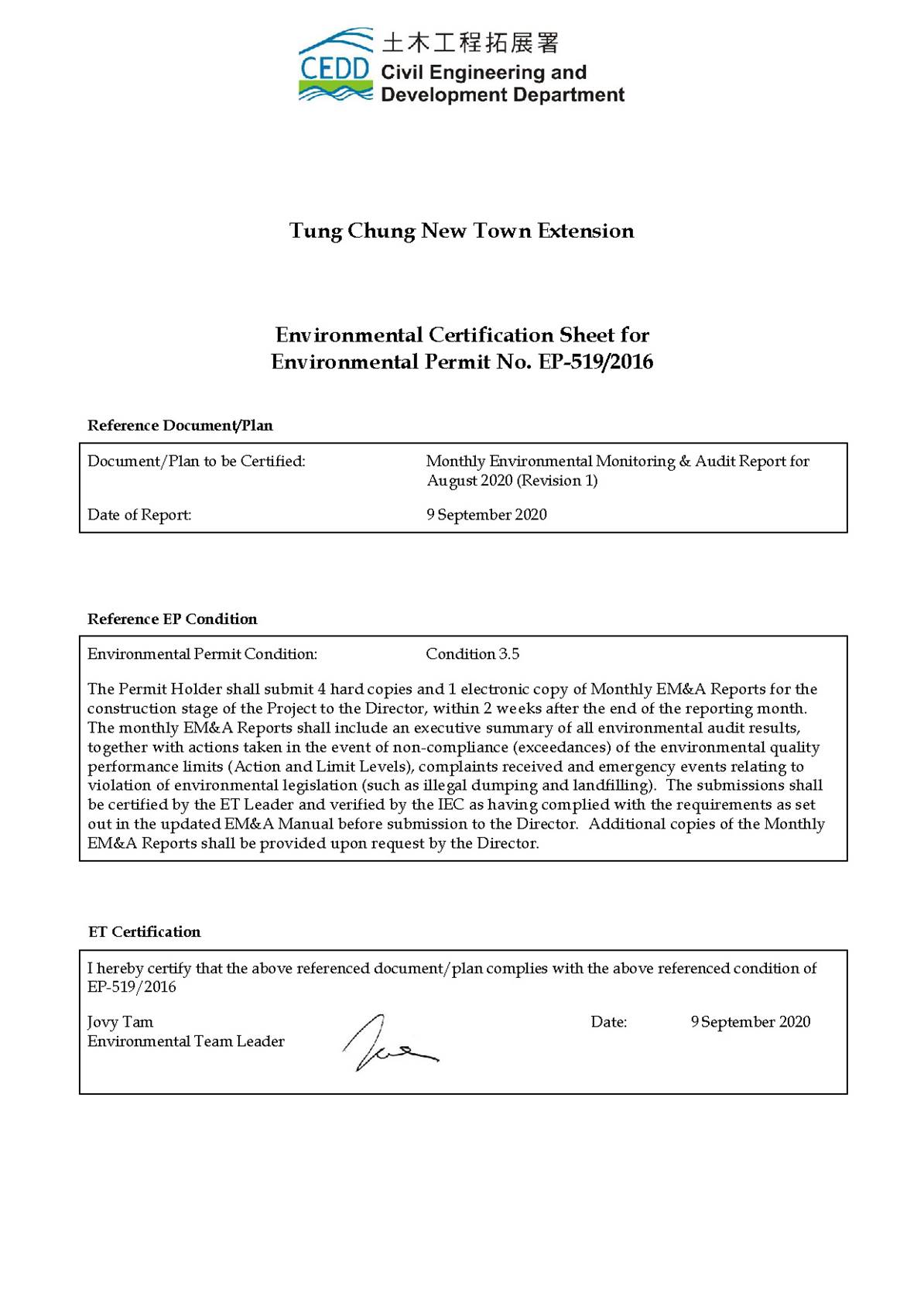This EM&A Report presents the findings of the EM&A activities undertaken during the period from 1 to 31 August 2020 in accordance with the Updated EM&A Manual and the requirements of the Environmental Permit (EP-519/2016).