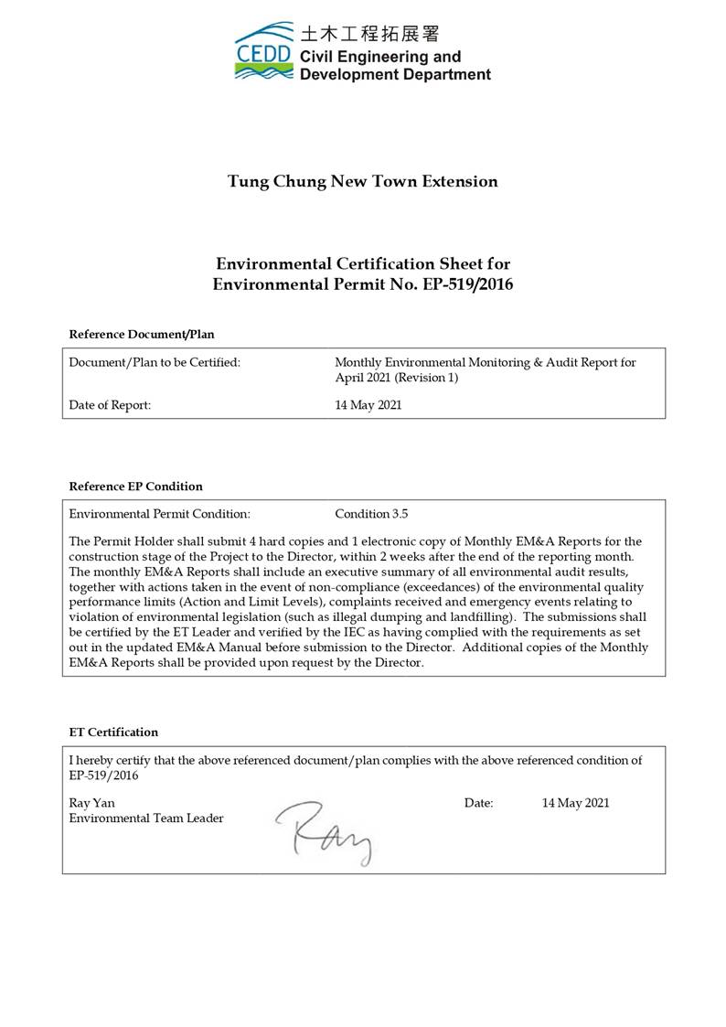 This EM&A Report presents the findings of the EM&A activities undertaken during the period from 1 to 30 April 2021 in accordance with the Updated EM&A Manual and the requirements of the Environmental Permit (EP-519/2016).