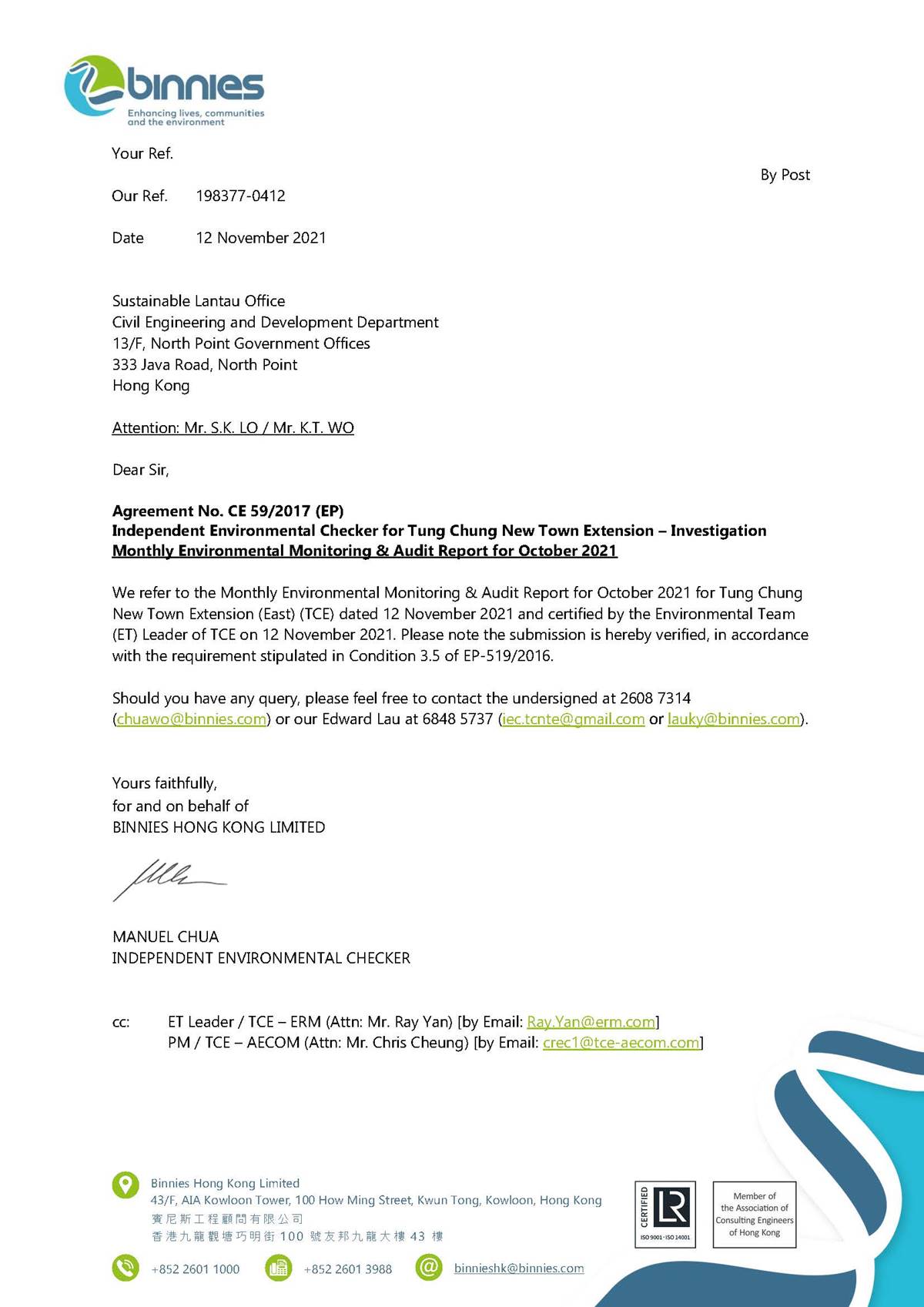 This EM&A Report presents the findings of the EM&A activities undertaken for the TCE Project during the period from 1 to 31 October 2021 in accordance with the Updated EM&A Manual and the requirements of the Environmental Permit (EP-519/2016).