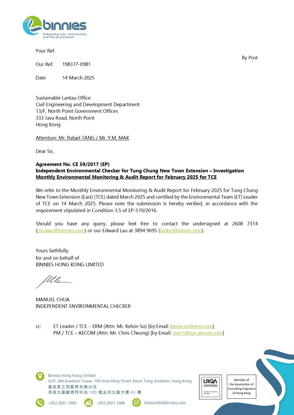 Environmental complaint related to Contract 2 regarding water quality was received by EPD on 12 February 2025 and referred on 25 February 2025. |