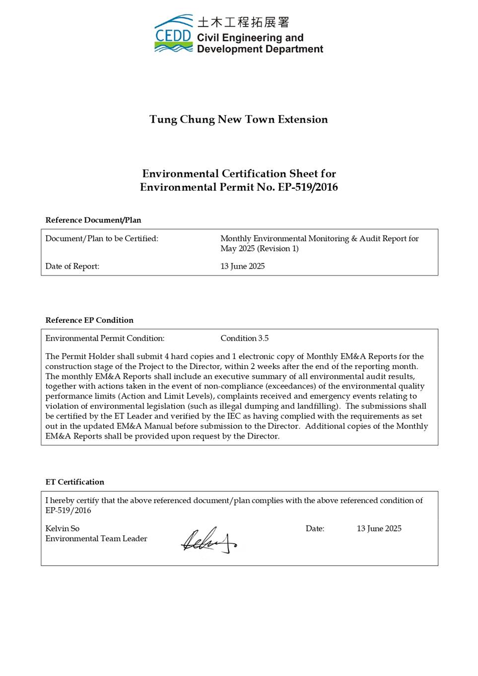 This EM&A Report presents the findings of the EM&A activities undertaken for the TCE Project during the period from 1 to 31 May 2025 in accordance with the Updated EM&A Manual and the requirements of the Environmental Permit (EP-519/2016).  The environmental monitoring, site inspection, environmental complaint handling and EM&A reporting in the temporary works area in Area 113 used by MTRC will be covered by EM&A programme of TUE and carried out by existing ET and IEC of TUE.
